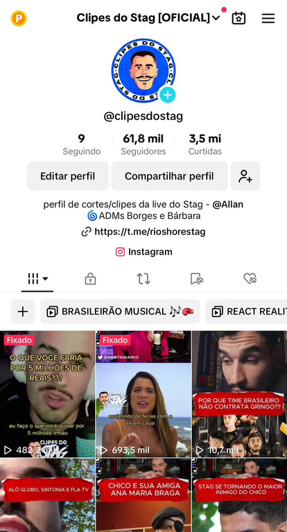 Com vídeos curtos e objetivos, o Tik Tok do Clipes do Stag é uma ótima alternativa para quem busca rir e saber das resenhas das lives, além de poder dar aquela compartilhada com os amigos!